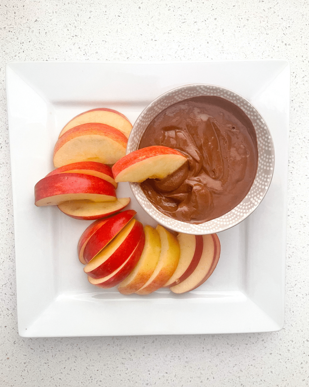 In a blender or in a food processor, combine all the ingredients except water and apples, using just 3 1/2 Tbsp of maple syrup. Puree until the mixture is smooth, about 30-60 seconds. Add water 1 Tbsp at a time to create the desired consistency.Step 2