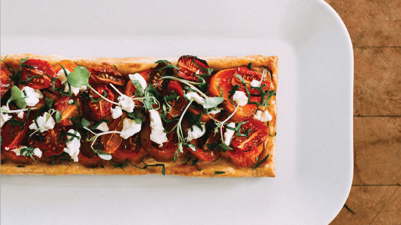 This Cherry Tomato and Sweet Potato Galettes appetizer is best served warm and fresh. A play on a classic French pastry but using sweet potatoes and cherry tomatoes creates a beautiful savory tart for any occasion.