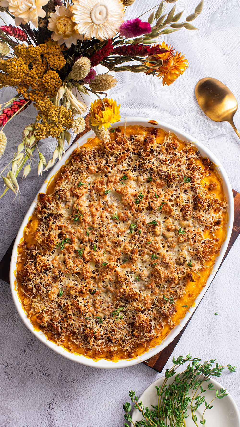 This dish features tender white beans luxuriating in a velvety onion and carrot puree. The beans are baked under a crisp lid of toasted breadcrumbs and sharp Gruyère cheese. Absolutely made for cozy season, this dish is the definition of stick-to-your-ribs good.
