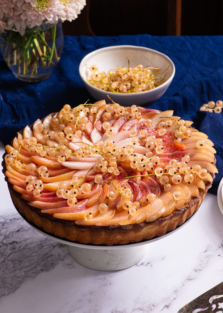 Thinly slice the peeled peaches and arrange the slices on top of the tart in a circular motion, working from the outside in. Garnish with the white currants, slice, and serve.