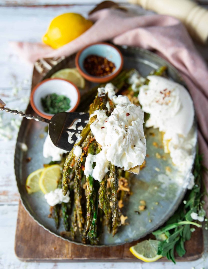 This simple parmesan crusted asparagus recipe makes a delicious side during the short but sweet Ontario asparagus season! It’s the season for Asparagus, and we love using Ontario Asparagus to make this simple and easy side dish–Parmesan Crusted Asparagus! Similar to the viral Parmesan Potatoes, this is the same version but uses seasonal Asparagus.We love serving this with a nice dollop of Burrata Cheese for an extra luxurious finish and a lovely texture contrast, feel free to skip that or use goat cheese or feta cheese if you’d like!